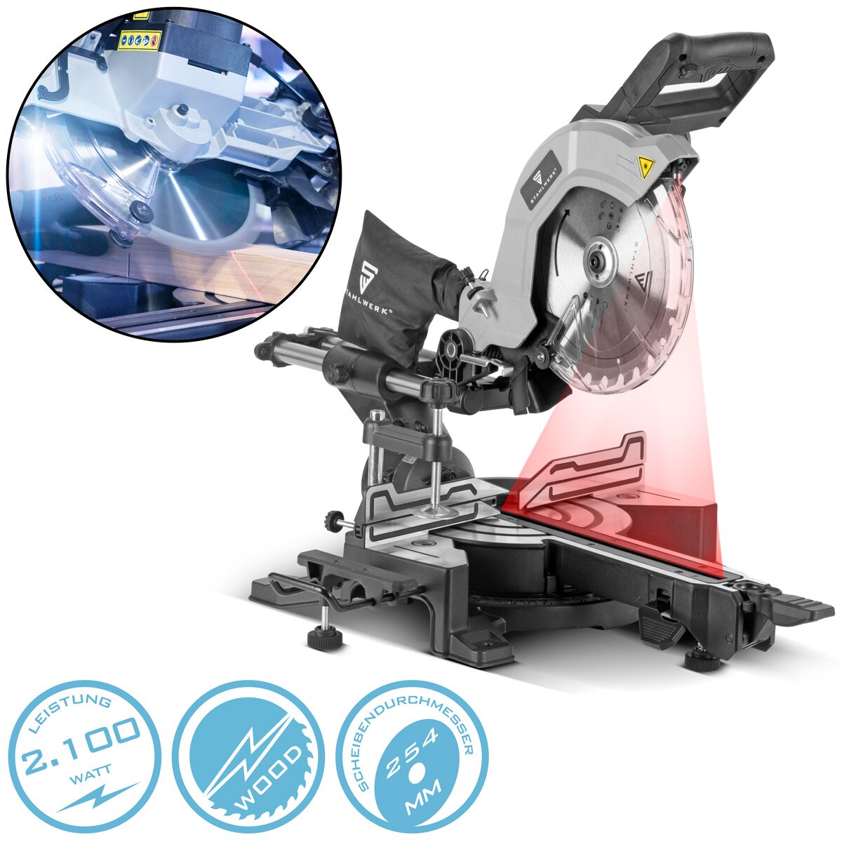 Najjača pila u svojoj klasi: poprečna, vučna i kutna pila idealna je za profesionalno rezanje drva, obojenih metala i kompozitnih materijala. Glatki rad motora vučne pile impresionira maksimalnom snagom od 2100 W. S velikim, bezstupanjskim rasponom podešavanja od -45° do +45° stupnjeva i kutom nagiba od -45° stupnjeva, kružna pila nudi maksimalnu fleksibilnost za sve radove piljenja. Zahvaljujući jasnoj ljestvici kutova, željeni kutovi zakošenja mogu se brzo postaviti. Točke mreže integrirane na kutnoj pili pojednostavljuju poravnavanje lista pile. Promjenjivi laser osigurava najveću preciznost pri piljenju točnim prikazom linije rezanja i uvijek osigurava savršenu sliku rezanja. Zahvaljujući širokoj potpornoj površini, podesivoj graničnoj šini i praktičnom steznom uređaju, čak i veći obradaci mogu se lako obraditi s pilom za rezanje. Proširivi bočni paneli nude produženu potpornu površinu za duže izratke. Kompaktan dizajn vučne pile i robusno kućište s protukliznim gumenim nožicama nude maksimalnu stabilnost. Integrirani sigurnosni prekidač i kočnica motora osiguravaju dodatnu sigurnost. Pila za rezanje i zakutavanje ima unaprijed izbušene rupe za montažu za jednostavno pričvršćivanje na radnu ploču ili postolje za pilu. Rezna pila može raditi ili s vrećom za sakupljanje strugotine ili s vanjskim sustavom za usisavanje. Uz težinu od samo 15,25 kg i praktičnu transportnu ručku, pila za rezanje je mobilna i lako se prenosi. Savršena pila za pronicljivog majstora. Idealno za industriju, zanate, radionice i DIY. Napomena: Prethodno montirani list pile nije prikladan za nehrđajući čelik.
